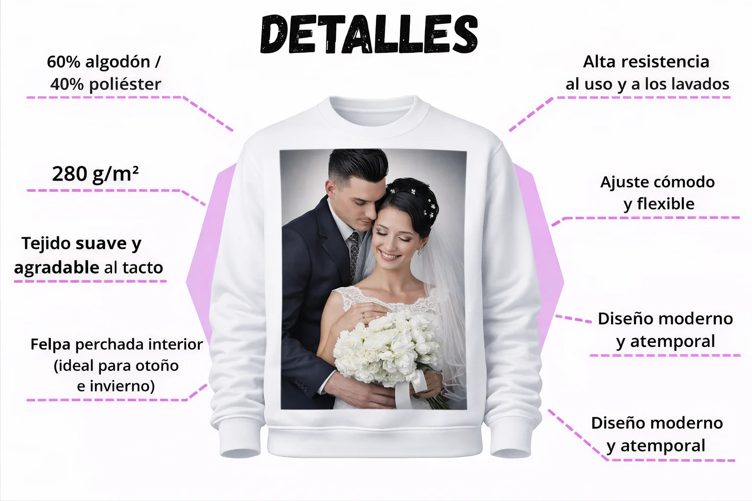 Disfruta de una sudadera personalizada diseñada para ofrecer máximo confort, estilo y durabilidad. Fabricada en una mezcla de algodón y poliéster de alta calidad, su felpa perchada de 280 g/m² proporciona un tacto suave y cálido, ideal para el día a día. Su diseño unisex con cuello redondo, puños y cinturilla en punto canalé 1×1 con elastano garantiza un ajuste cómodo que se adapta al cuerpo sin oprimir, manteniendo la forma lavado tras lavado. El cubrecosturas reforzado en el interior del cuello aporta mayor resistencia y un acabado cuidado. Perfecta para personalizar con nombres, frases, ilustraciones o diseños únicos. Una sudadera versátil para uso diario o como regalo personalizado original.